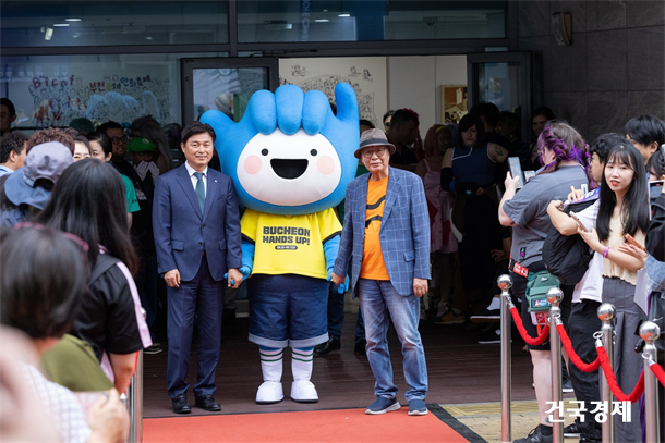 Á¶¿ëÀÍ ºÎõ½ÃÀå°ú Á¶°üÁ¦ ÀÌ»çÀåÀÌ 2023³â 9¿ù 15ÀÏ ¿ÀÈÄ °æ±â ºÎõ Çѱ¹¸¸È¹Ú¹°°ü ¾ß¿Ü¿¡¼ ÁøÇàµÈ °³¸·½Ä ·¹µåÄ«Æê Çà»ç¿¡ Âü¿©Çϰí ÀÖ´Ù. Á¦26ȸ ºÎõ±¹Á¦¸¸ÈÃàÁ¦´Â 9¿ù 14ÀϺÎÅÍ 17ÀϱîÁö 4Àϰ£ ¡®¸¸È, ¸¶À½À» ¿´Ù¡¯¸¦ ÁÖÁ¦·Î Çѱ¹¸¸È¹Ú¹°°ü ÀÏ´ë¿¡¼ ¿¸°´Ù.