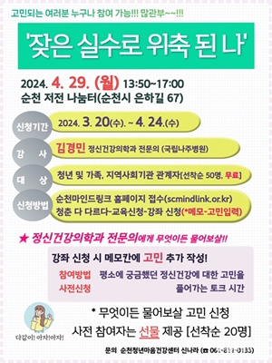 ¼øÃµ½Ã, û³â ¸¶À½ °Ç°­ ȸº¹ °ø°³°­Á °³ÃÖÀÏ»ó»ýȰ ¼Ó¿¡¼­ ¿Ã¹Ù¸¥ Á¤½Å°Ç°­ °ü¸® ¹æ¹ý ¼Ò°³ ¼øÃµ½Ã(½ÃÀå ³ë°ü±Ô)´Â ¿À´Â 29ÀÏ ¿ÀÈÄ 2½Ã ¼øÃµ ÀúÀü ³ª´®ÅÍ¿¡...