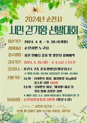 °È´Â µµ½Ã ¼øÃµ, ½Ã¹Î °È±â¿Õ ¼±¹ß´ëȸ Âü¿©ÀÚ ¸ðÁý...100¸í ¼±Á¤ - 4¿ù 5ÀϱîÁö üÁö¹æ ÃøÁ¤ÇÏ°í °È±â¾Û ¿öÅ©¿Â ¿¹¾à ½Åû - ¼øÃµ½Ã(½ÃÀå ³ë°ü±Ô)´Â ...