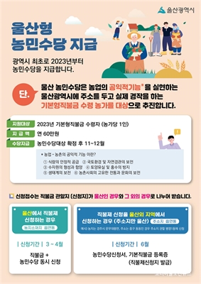 ¿ï»ê½Ã'Á÷ºÒÁ¦ ½ÅûÇÏ½Ç ¶§ ³ó¹Î¼ö´çµµ ½ÅûÇϼ¼¿ä'¿ÃÇØºÎÅÍ ¿ï»êÇü ³ó¹Î¼ö´ç Áö±Þ, ³ó°¡´ç 60¸¸ ¿ø¿ï»ê½Ã´Â Áö¿ª ³ó¹ÎÀÇ ¼Òµæ¾ÈÁ¤°ú ±Í³óÀÎ À¯ÀÔÀ¯µµ¸¦ À§ÇØ ¿ÃÇØ...