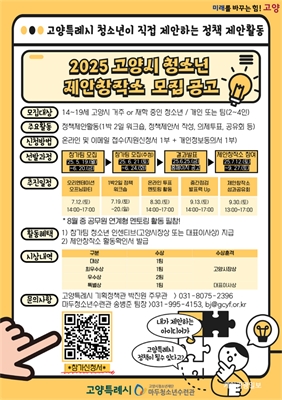 °í¾ç½Ã, 2025³â û¼Ò³â Á¦¾ÈâÀÛ¼Ò Âü°¡ÀÚ ¸ðÁý5¿ù 19ÀÏ~6¿ù 20ÀÏ Á¢¼ö⋯Á¤Ã¥Á¦¾È ±³À°, Á¦¾È¼­ ÀÛ¼º, ÄÁ¼³ÆÃ±îÁö¿©¼º°¡Á·ºÎ °ø¸ð»ç¾÷ ¼±Á¤&#...