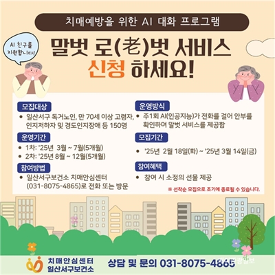 °í¾ç½Ã Àϻ꼭±¸º¸°Ç¼Ò, ¡®ÀΰøÁö´É(AI) ¸»¹þ ·Î(ÖÕ)¹þ ¼­ºñ½º¡¯Âü¿© ´ë»óÀÚ ¸ðÁý3¿ù 14ÀϱîÁö 150¸í ¼±Âø¼ø Á¢¼ö¡¦¸¸ 70¼¼ ÀÌ»ó °í·ÉÀÚ µî ´ë»ó °í¾çƯ...