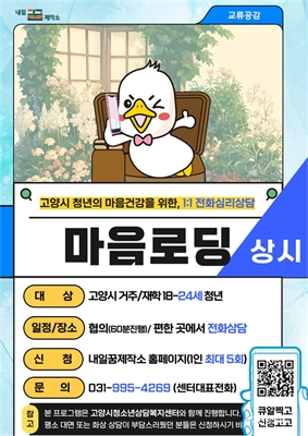 °í¾ç½Ã ³»ÀϲÞÁ¦ÀÛ¼Ò, û³â ´ë»ó ÀüÈ­½É¸®»ó´ã ÇÁ·Î±×·¥ ¿î¿µ 1:1 ÀüÈ­ »ó´ã¡¦¡®²Ç²Ç ¾ó¾îºÙÀº û³â ¸¶À½¿¡ µû¶æÇÑ ·Îµù¡¯ °í¾çƯ·Ê½Ã(½ÃÀå À̵¿È¯)°¡ ¸¶À½ °Ç°­...