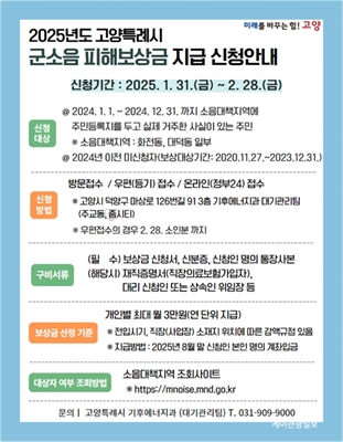 °í¾ç½Ã, 2025³âµµ ±º¼ÒÀ½ ÇÇÇØº¸»ó±Ý ½Åû Á¢¼ö- 1¿ù 31ÀÏ~2¿ù 28ÀϱîÁö¡¦È­Àüµ¿¡¤´ë´öµ¿ ³» ¼ÒÀ½´ëÃ¥Áö¿ª °ÅÁÖÀÚ ´ë»ó °í¾çƯ·Ê½Ã(½ÃÀå À̵¿È¯)´Â ¿À´Â ...