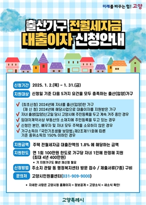 °í¾ç½Ã, 2025³â Ãâ»ê°¡±¸ Àü¿ù¼¼ÀÚ±Ý ´ëÃâÀÌÀÚ Áö¿ø ½Åû Á¢¼ö