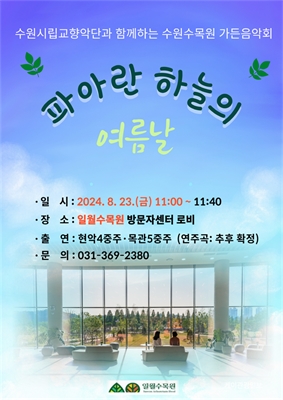 ¼ö¿ø ÀÏ¿ù¼ö¸ñ¿ø¿¡¼­ ¼ö¿ø½Ã¸³±³Çâ¾Ç´Ü°ú ÇÔ²²ÇÏ´Â °¡µçÀ½¾Çȸ ¿­¸°´Ù23ÀÏ ¿ÀÀü 11½Ã ÀÏ¿ù¼ö¸ñ¿ø ¹æ¹®ÀÚ¼¾ÅÍ¿¡¼­¡®ÆÄ¾Æ¶õ ÇÏ´ÃÀÇ ¿©¸§³¯¡¯ °³ÃÖ ¼ö¿ø½Ã(½ÃÀå ÀÌÀçÁØ)...