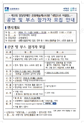 ¼ö¿ø½Ã, ¹ß´ÞÀå¾ÖÀÎ ¹®È­¿¹¼úÆä½ºÆ¼¹ú ¡®»õºûÀ¸·Î ¾î¿ï¸²¡¯ °ø¿¬¡¤ºÎ½º Âü°¡ÀÚ ¸ðÁý28ÀϱîÁö °ø¿¬ 10ÆÀ, ºÎ½º 20°³¼Ò ¸ðÁý¡¦11¿ù 1ÀÏ °æ±â¾ÆÆ®¼¾ÅÍ¿¡¼­ ¿­·Á¼ö...