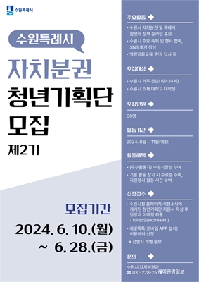 ¡®¼ö¿øÆ¯·Ê½Ã ÀÚÄ¡ºÐ±Ç û³â±âȹ´Ü¡¯ Á¦2±â ¸ðÁýSNS µî Ȱ¿ëÇØ ¼ö¿ø½Ã ÀÚÄ¡ºÐ±Ç¡¤Æ¯·Ê½Ã Ȱ¼ºÈ­Á¤Ã¥ È«º¸¡¦6¿ù 28ÀϱîÁö 30¸í ¸ðÁý¼ö¿ø½Ã(½ÃÀå ÀÌÀçÁØ)°¡ SN...
