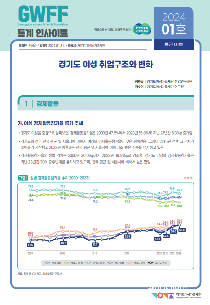 GWFF´Â °æ±âµµ¿©¼º°¡Á·Àç´ÜÀÇ ¿µ¹®¸í À̴ϼÈÀÌ´Ù. Ⱓȣ Å׸¶´Â ¡®°æ±âµµ ¿©¼º Ãë¾÷±¸Á¶¿Í º¯È¡¯·Î, Åë°èûÀÇ °æÁ¦È°µ¿Àα¸Á¶»ç¿Í Áö¿ªº°°í¿ëÁ¶»ç ÀڷḦ Ȱ¿ëÇØ °æ±âµµ ¿©¼ºÀÇ Ãë¾÷±¸Á¶ º¯È¸¦ ºÐ¼®Çß´Ù.