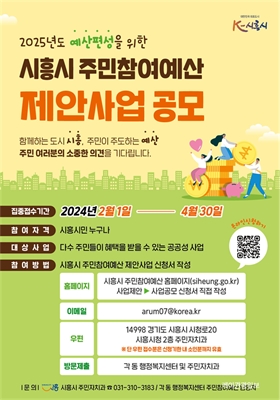 2024³â ½ÃÈï½Ã ÁÖ¹ÎÂü¿©¿¹»ê Á¦¾È»ç¾÷ °ø¸ð ½ÃÈï½Ã(½ÃÀå ÀÓº´ÅÃ)´Â 2¿ù 1ÀϺÎÅÍ 4¿ù 30ÀϱîÁö ÁֹεéÀÌ Á÷Á¢ »ç¾÷À» Á¦¾ÈÇÏ´Â ¡®½ÃÈï½Ã ÁÖ¹ÎÂü¿©¿¹»ê Á¦¾È...