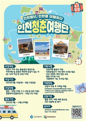 ¹ß±æµû¶ó °¨¼º ÃæÀü! ÀÎõûÃá¿©Çà´Ü 4±â ¸ðÁýÁß- ÀÎõ û³â ´ë»ó ¿©Çà ÄÜÅÙÃ÷ Á¦ÀÛ ¹× È«º¸ µî ¿©Çà Ȱµ¿ºñ Áö¿ø -¡Û ÀÎõ±¤¿ª½Ã(½ÃÀå À¯Á¤º¹)¿Í ÀÎõ°ü±¤°ø...