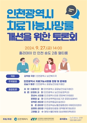 ÀÎõ½Ã, Ä¡·á°¡´É»ç¸Á·ü °³¼±À» À§ÇÑ Åä·Ðȸ °³ÃÖ- Ä¡·á°¡´É»ç¸Á·ü °æ°¨À» À§ÇÑ ¿ì¼±¼øÀ§ µµÃâ°ú Àü¹®°¡ ÀÇ°ß ¼ö·Å -ÀÎõ±¤¿ª½Ã´Â 9¿ù 27ÀÏ È¦¸®µ¥ÀÌÀÎ ¼Ûµµ¿¡¼­...