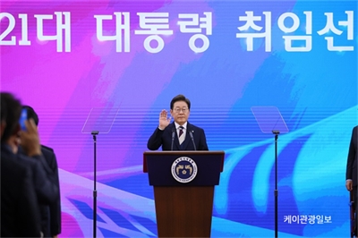 ÀÌÀç¸í ´ëÅë·ÉÀÌ 2025.6.4ÀÏ ¼­¿ï ¿©Àǵµ ±¹È¸¿¡¼­ ¿­¸° Á¦21´ë ´ëÅë·É ÃëÀÓ¼±¼­½Ä¿¡¼­ ÃëÀÓ ¼±¼­¸¦ Çϰí ÀÖ´Ù(»çÁø=¹®È­Ã¼À°°ü±¤ºÎ)´ëÇѹα¹ Á¦21´ë ´ëÅë...