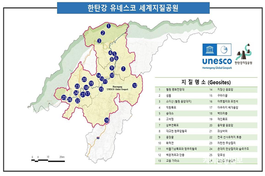 ÇÑź°Àº DMZ ÀÏ¿øÀÇ Ã»Á¤ »ýŰè¿Í ÇÔ²² 50¸¸~10¸¸ ³â Àü ºÏÇÑ ¿À¸®»ê¿¡¼ ºÐÃâÇÑ ¿ë¾ÏÀÌ ±»¾î ¸¸µé¾îÁø ÁÖ»óÀý¸®¿Í º£°³¿ë¾Ï µî ³»·ú¿¡¼ º¸±â ¾î·Á¿î È»ê ÁöÇüÀÌ Àß º¸Á¸µÅ ÁöÁúÇÐÀû °¡Ä¡°¡ ¸Å¿ì ³ô°í ¼¼°èÀûÀ¸·Îµµ º¸±â µå¹® Àå°üÀ» ÀÚ¶ûÇÑ´Ù. Æ÷õ ¾ÆÆ®¹ë¸®¿Í ºñµÑ±â³¶ÆøÆ÷, ¿¬Ãµ Àü°îÀ¾ Àü°î¸® À¯Àû ÅäÃþ°ú ÀÓÁø° ÁÖ»óÀý¸® µî 26°³ÀÇ ÁöÁú¸í¼Ò¸¦ º¸À¯Çϰí ÀÖ´Ù.